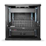 La solución ideal para guardar y cargar sus dispositivos portátiles en un armario de red o de servidores estándar. 14 compartimentos con un ancho de 28 mm cada uno Robustos estribos de acero para la fijación de los dispositivos Conducto para cables y cierre de velcro en la parte trasera Bandeja para la longitud de cable sobrante en la parte inferior (20x410x140 mm) Este estante especial le permite utilizar cualquier armario convencional de 482,6 mm (19") para guardar sus dispositivos portátiles, tales como tabletas, ordenadores portátiles o smartphones. Los robustos estribos de acero ofrecen espacio para un máximo de 14 dispositivos. En la parte frontal se encuentran conductos para cables que permiten el cableado óptimo de los dispositivos, por ejemplo, para conectarlos para la carga a una toma de corriente. La parte inferior está dotada de una bandeja para colocar la longitud de cable sobrante. Para facilitar el uso, el estante se puede extraer, en estado montado, hacia delante para acceder de manera rápida y sencilla a los componentes conectados. En el nivel de 482,6 mm (19») solo se requiere una unidad de altura (1UA) para fijar el estante. La altura total, incluyendo los estribos metálicos, es de 175 mm.