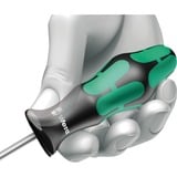 El juego de destornilladores Wera 334/6 con tecnología Lasertip consta de seis partes, dos phillips y cuatro destornilladores de ranura. Por medio de la luz láser, se crea una estructura de superficie de bordes afilados en la punta de la cuchilla. El tratamiento con láser provoca una dureza de las trazas de hasta 1000 HV 0.3. La superficie micro-rugosa muerde firmemente en la cabeza del tornillo, asegura un ajuste seguro del destornillador en el tornillo y evita que se deslice fuera de la cabeza del tornillo. Con el mango de forma de fuerza multicomponente desarrollado por Wera, toda la mano encuentra contacto con el mango. Las zonas suaves y duras se deslizan a través de la mano como ruedas cuando se agarran y permiten velocidades de trabajo particularmente altas. Las zonas blandas y de agarre son superficies de instalación óptimas para la mano y permiten una transmisión de alta potencia. El marcado del mango con el símbolo del tornillo y el tamaño del mango también hace que sea más fácil de encontrar en la bolsa de herramientas y en el lugar de trabajo. El juego de destornilladores viene con un bastidor que se puede unir a la pared. Esto garantiza un almacenamiento adecuado y un acceso rápido.
